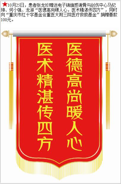 患者张龙珍赠送电子锦旗感谢骨与创伤中心马纪坤等人,并向医疗救助基金捐赠善款100元。-锦旗-患者心声-患者服务-重庆医科大学附属第三医院【官方网站】