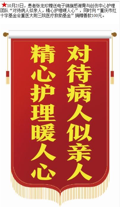 患者张龙珍赠送电子锦旗感谢骨与创伤中心护理团队,并向医疗救助基金捐赠善款100元。-锦旗-患者心声-患者服务-重庆医科大学附属第三医院【官方网站】