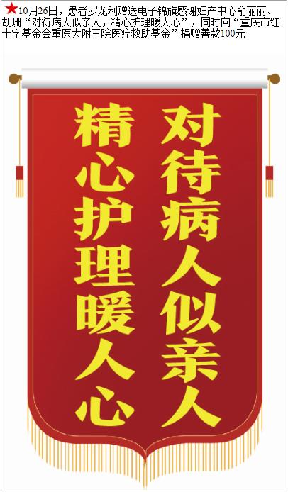 患者罗龙利赠送电子锦旗感谢妇产中心俞丽丽等人,并向医疗救助基金捐赠善款100元。-锦旗-患者心声-患者服务-重庆医科大学附属第三医院【官方网站】