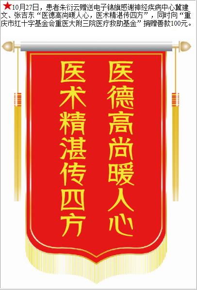 患者朱衍云赠送电子锦旗感谢神经疾病中心冀建文等人,并向医疗救助基金捐赠善款100元。-锦旗-患者心声-患者服务-重庆医科大学附属第三医院【官方网站】