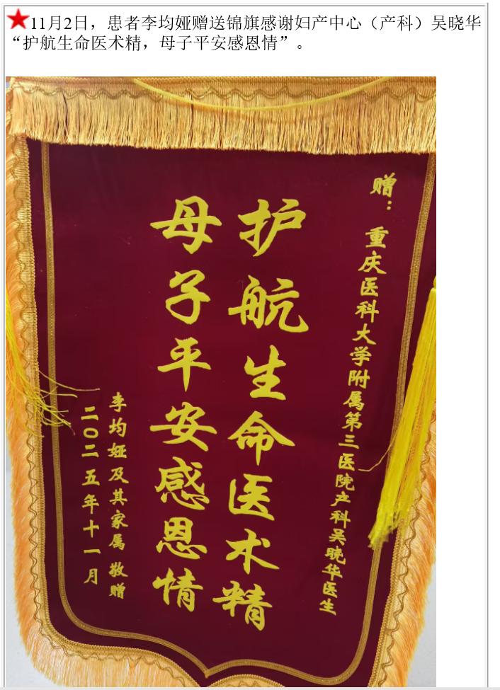 患者李均娅赠送锦旗感谢妇产中心(产科)吴晓华。-锦旗-患者心声-患者服务-重庆医科大学附属第三医院【官方网站】