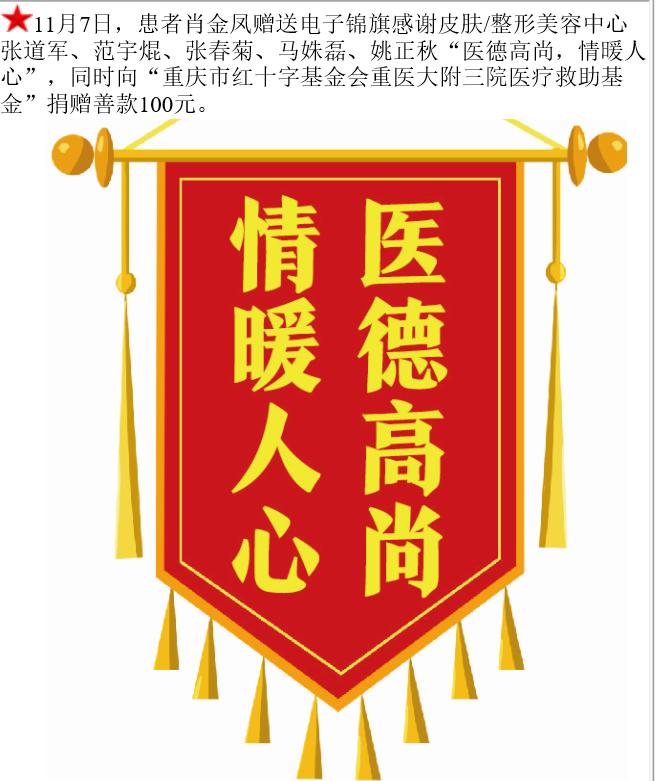患者肖金凤赠送电子锦旗感谢皮肤/整形美容中心张道军等人,并向医疗救助基金捐赠善款100元。-锦旗-患者心声-患者服务-重庆医科大学附属第三医院【官方网站】