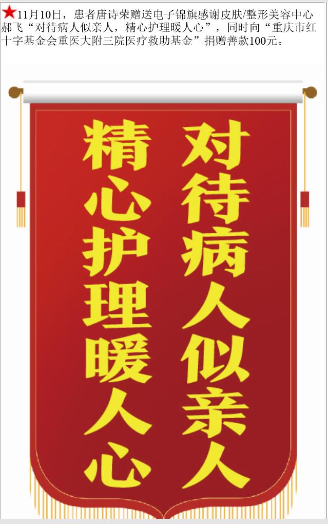 患者唐诗荣赠送电子锦旗感谢皮肤/整形美容中心郝飞,并向医疗救助基金捐赠善款100元。-锦旗-患者心声-患者服务-重庆医科大学附属第三医院【官方网站】