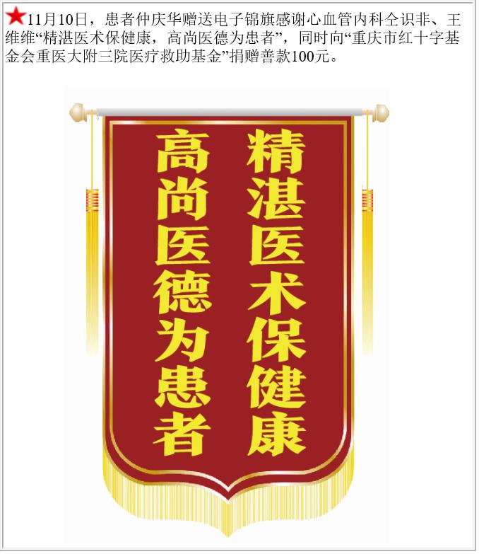 患者仲庆华赠送电子锦旗感谢心血管内科仝识非等人,并向医疗救助基金捐赠善款100元。-锦旗-患者心声-患者服务-重庆医科大学附属第三医院【官方网站】