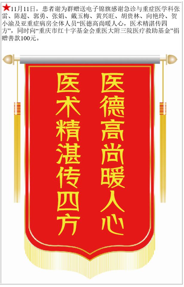 患者谢为群赠送电子锦旗感谢急诊与重症医学科张雷等人,并向医疗救助基金捐赠善款100元。-锦旗-患者心声-患者服务-重庆医科大学附属第三医院【官方网站】