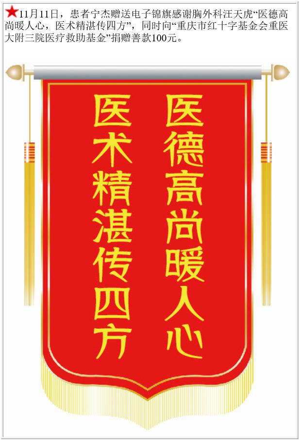 患者宁杰赠送电子锦旗感谢胸外科汪天虎,并向医疗救助基金捐赠善款100元。-锦旗-患者心声-患者服务-重庆医科大学附属第三医院【官方网站】