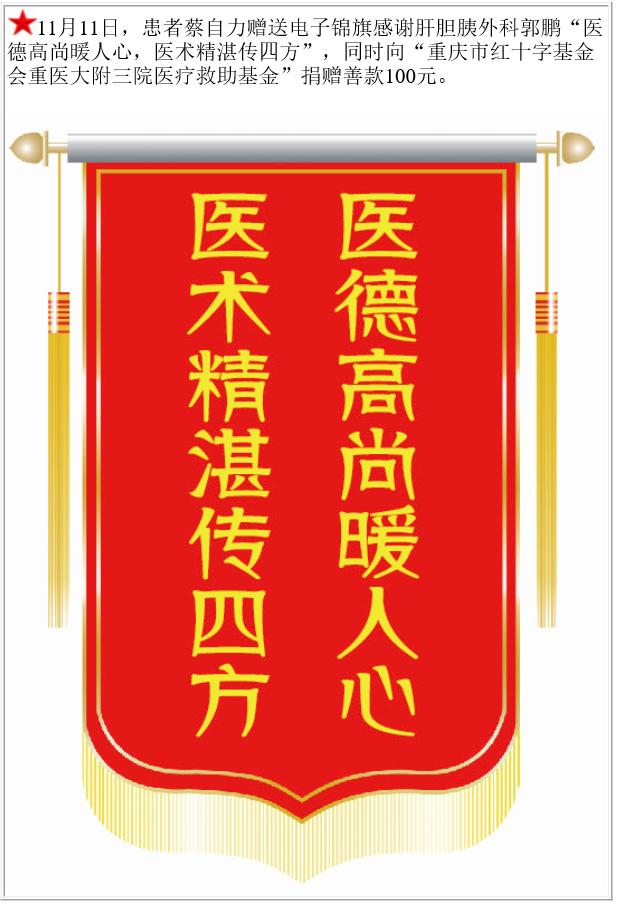 患者蔡自力赠送电子锦旗感谢肝胆胰外科郭鹏,并向医疗救助基金捐赠善款100元。-锦旗-患者心声-患者服务-重庆医科大学附属第三医院【官方网站】