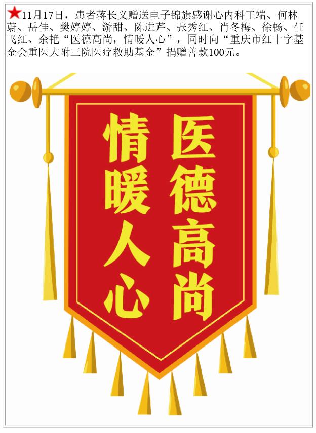 患者蒋长义赠送电子锦旗感谢心血管内科王端等,并向医疗救助基金捐赠善款100元。-锦旗-患者心声-患者服务-重庆医科大学附属第三医院【官方网站】
