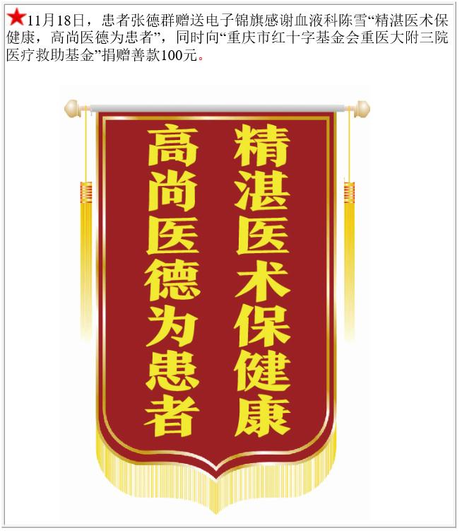 患者张德群赠送电子锦旗感谢血液科陈雪,并向医疗救助基金捐赠善款100元。-锦旗-患者心声-患者服务-重庆医科大学附属第三医院【官方网站】