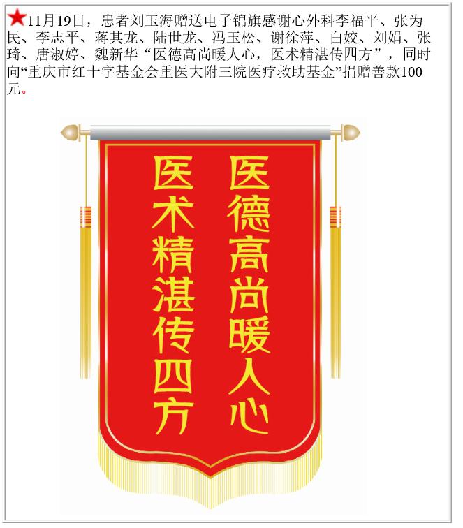 患者刘玉海赠送电子锦旗感谢心血管外科李福平等,并向医疗救助基金捐赠善款100元。-锦旗-患者心声-患者服务-重庆医科大学附属第三医院【官方网站】