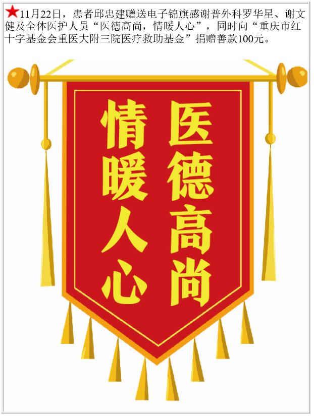 患者邱忠建赠送电子锦旗感谢普外科罗华星等,并向医疗救助基金捐赠善款100元。-锦旗-患者心声-患者服务-重庆医科大学附属第三医院【官方网站】