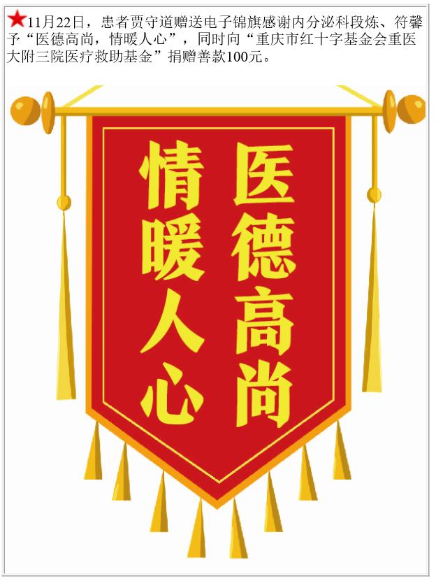 患者贾守道赠送电子锦旗感谢内分泌疾病中心段炼等,并向医疗救助基金捐赠善款100元。-锦旗-患者心声-患者服务-重庆医科大学附属第三医院【官方网站】