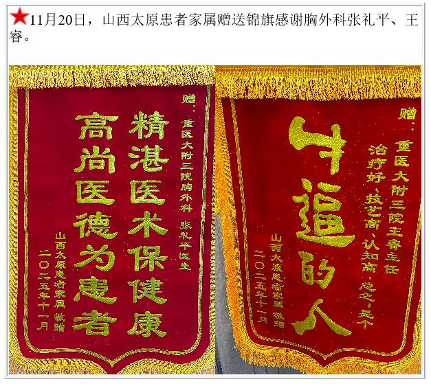山西太原患者家属赠送锦旗感谢胸外科张礼平等人。-锦旗-患者心声-患者服务-重庆医科大学附属第三医院【官方网站】