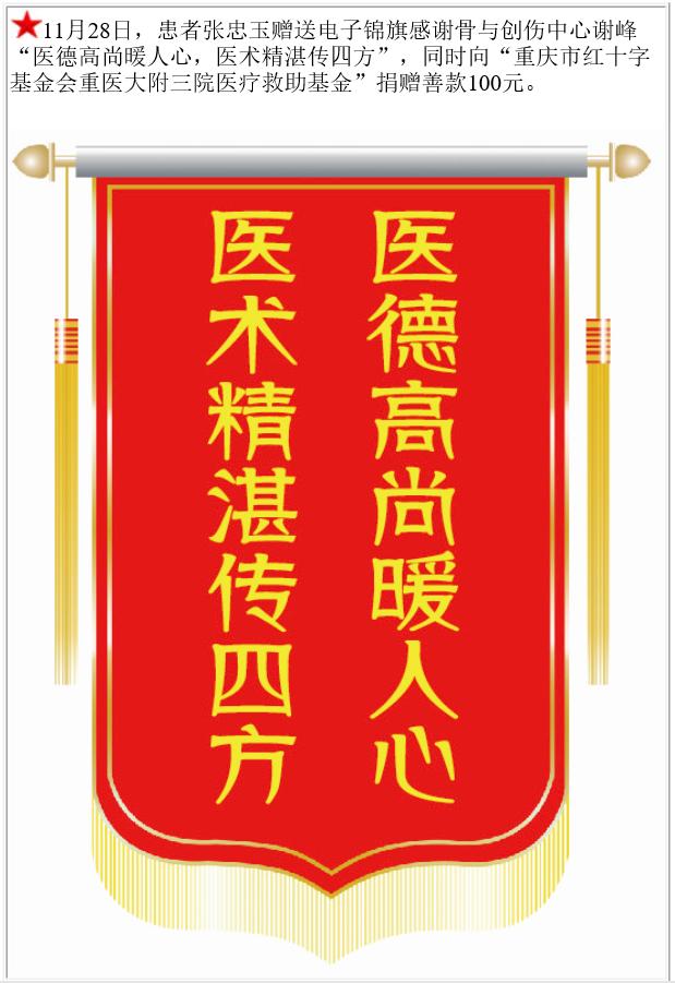 患者张忠玉赠送电子锦旗感谢骨与创伤中心谢峰,并向医疗救助基金捐赠善款100元。-锦旗-患者心声-患者服务-重庆医科大学附属第三医院【官方网站】