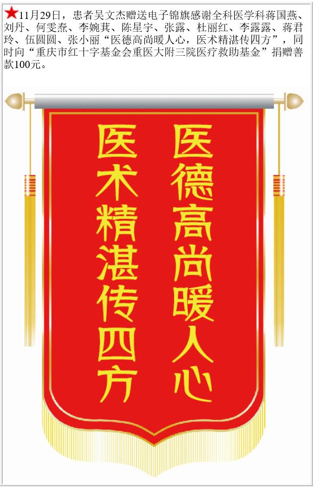 患者吴文杰赠送电子锦旗感谢全科医学科蒋国燕等,并向医疗救助基金捐赠善款100元。-锦旗-患者心声-患者服务-重庆医科大学附属第三医院【官方网站】