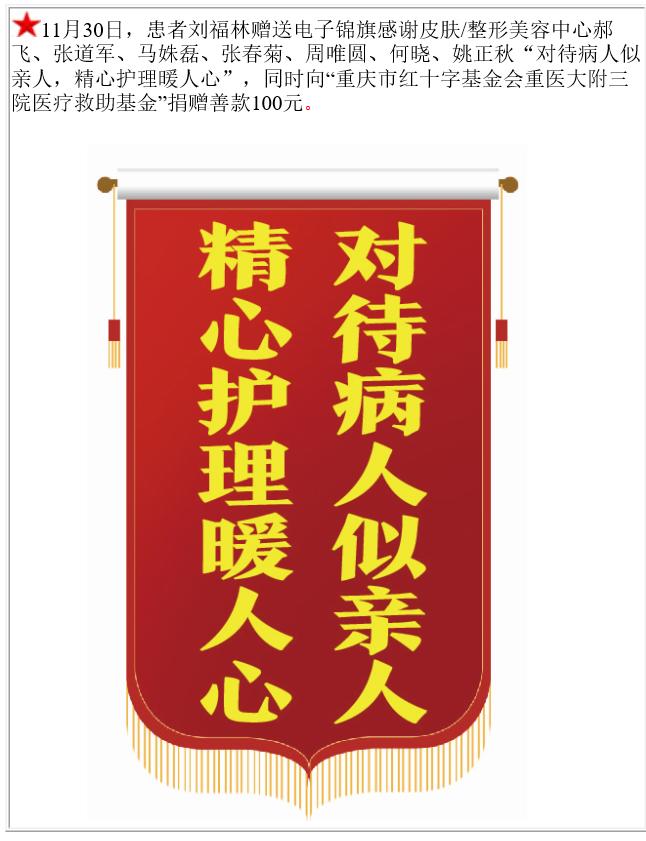 患者刘福林赠送电子锦旗感谢皮肤/整形美容中心郝飞等,并向医疗救助基金捐赠善款100元。-锦旗-患者心声-患者服务-重庆医科大学附属第三医院【官方网站】