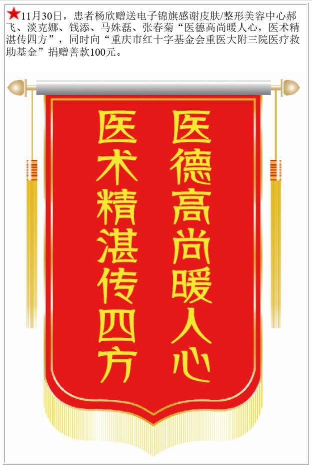 患者杨欣赠送电子锦旗感谢皮肤/整形美容中心郝飞等,并向医疗救助基金捐赠善款100元。-锦旗-患者心声-患者服务-重庆医科大学附属第三医院【官方网站】