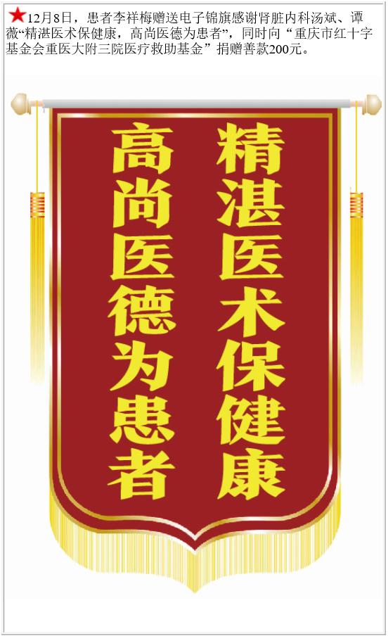 患者李祥梅赠送电子锦旗感谢肾脏内科汤斌等,并向医疗救助基金捐赠善款100元。-锦旗-患者心声-患者服务-重庆医科大学附属第三医院【官方网站】