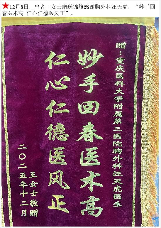 患者王女士赠送锦旗感谢胸外科汪天虎。-锦旗-患者心声-患者服务-重庆医科大学附属第三医院【官方网站】
