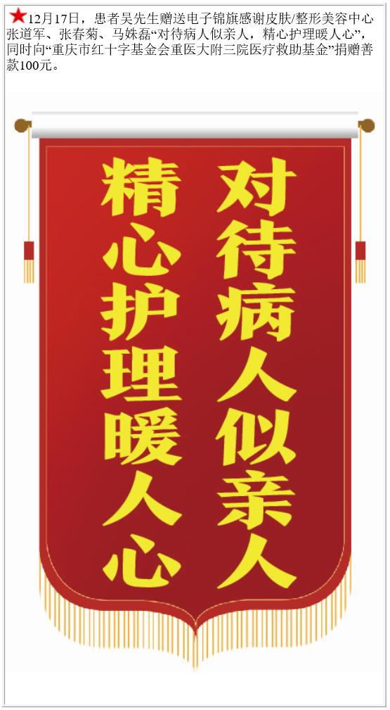 患者吴先生赠送电子锦旗感谢皮肤/整形美容中心张道军等,并向医疗救助基金捐赠善款100元。-锦旗-患者心声-患者服务-重庆医科大学附属第三医院【官方网站】