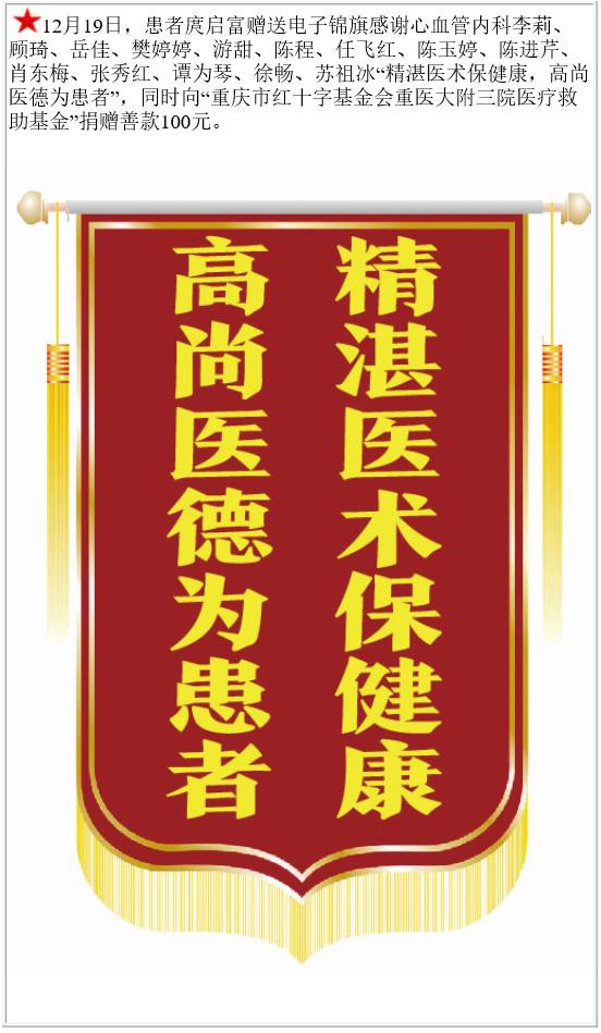 患者庹启富赠送电子锦旗感谢心血管内科李莉等,并向医疗救助基金捐赠善款100元。-锦旗-患者心声-患者服务-重庆医科大学附属第三医院【官方网站】