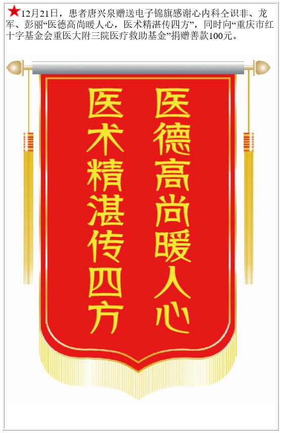 患者唐兴泉赠送电子锦旗感谢心内科仝识非等,并向医疗救助基金捐赠善款100元。-锦旗-患者心声-患者服务-重庆医科大学附属第三医院【官方网站】