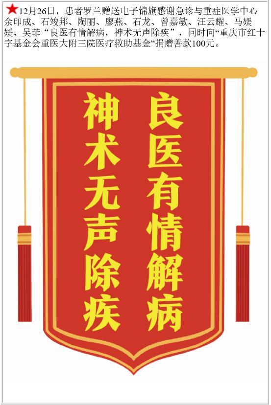 患者罗兰赠送电子锦旗感谢急诊与重症医学中心余印成等,并向医疗救助基金捐赠善款100元。-锦旗-患者心声-患者服务-重庆医科大学附属第三医院【官方网站】
