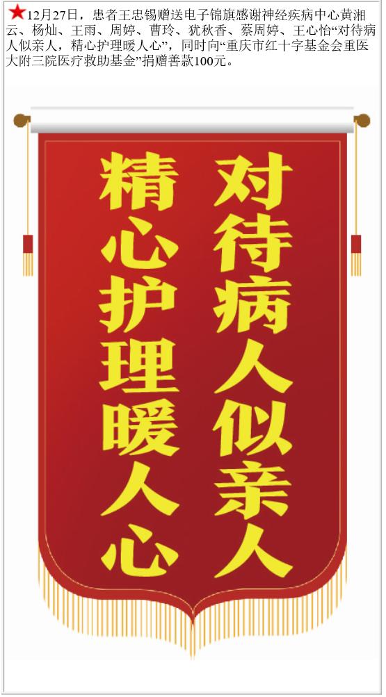 患者王忠锡赠送电子锦旗感谢神经疾病中心黄湘云等,并向医疗救助基金捐赠善款100元。-锦旗-患者心声-患者服务-重庆医科大学附属第三医院【官方网站】