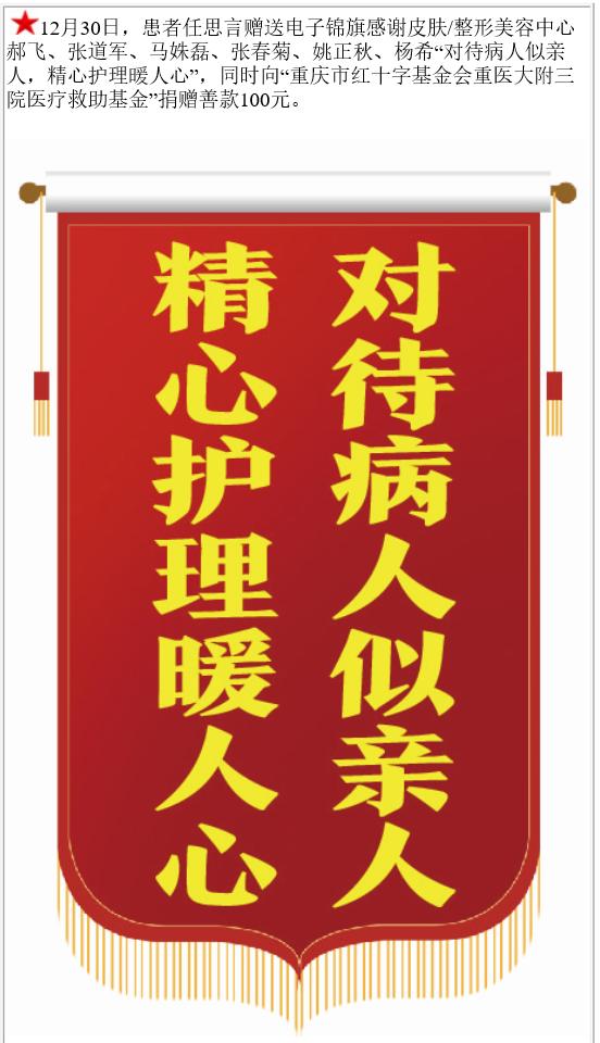 患者任思言赠送电子锦旗感谢皮肤/整形美容中心郝飞等,并向医疗救助基金捐赠善款100元。-锦旗-患者心声-患者服务-重庆医科大学附属第三医院【官方网站】