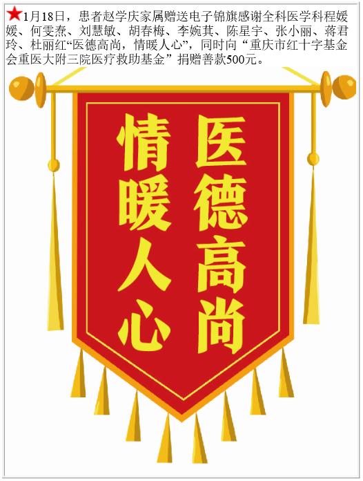 患者赵学庆家属赠送电子锦旗感谢全科医学科程媛媛等,并向医疗救助基金捐赠善款500元。-锦旗-患者心声-患者服务-重庆医科大学附属第三医院【官方网站】
