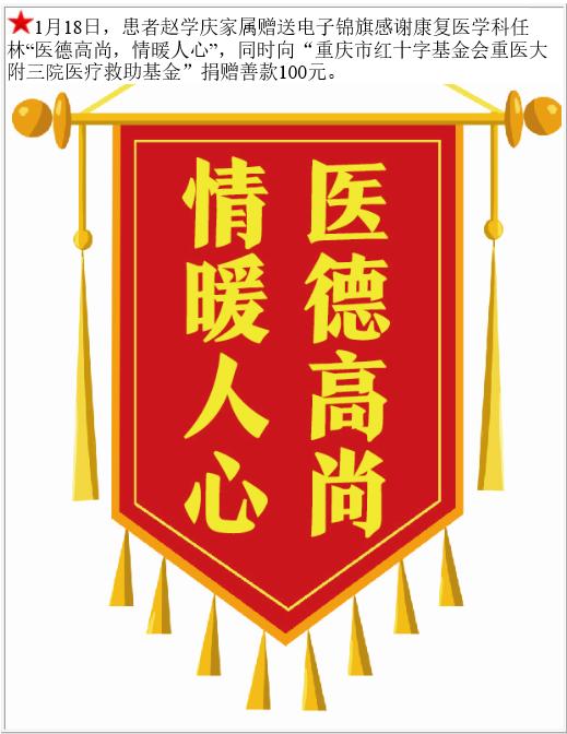 患者赵学庆家属赠送电子锦旗感谢康复医学科任林,并向医疗救助基金捐赠善款100元。-锦旗-患者心声-患者服务-重庆医科大学附属第三医院【官方网站】