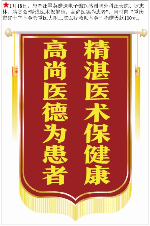 患者汪翠英赠送电子锦旗感谢胸外科汪天虎等,并向医疗救助基金捐赠善款100元。-锦旗-患者心声-患者服务-重庆医科大学附属第三医院【官方网站】
