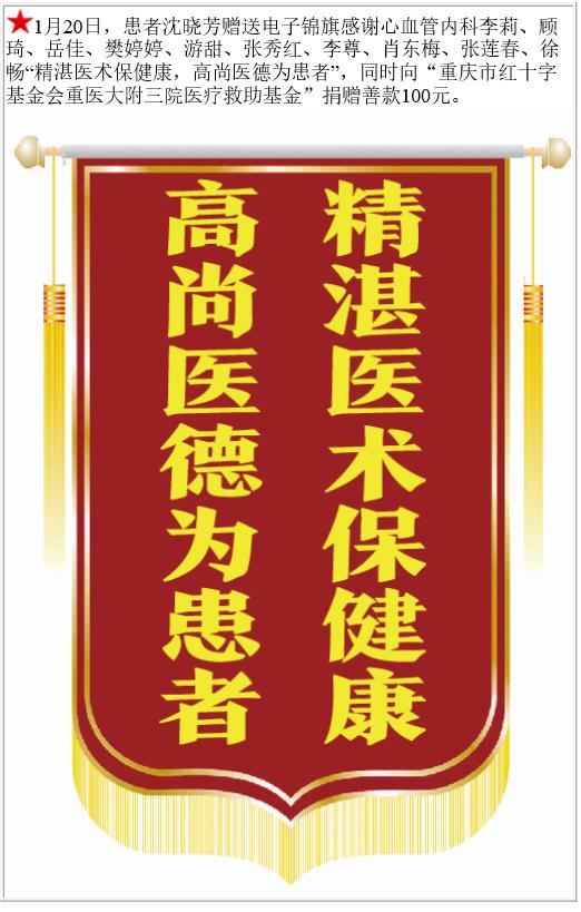 患者沈晓芳赠送电子锦旗感谢心血管内科李莉等,并向医疗救助基金捐赠善款100元。-锦旗-患者心声-患者服务-重庆医科大学附属第三医院【官方网站】