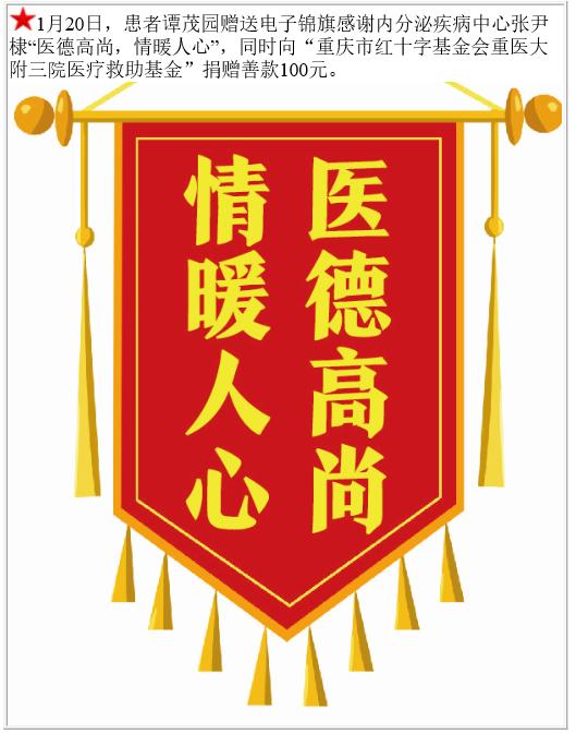 患者谭茂园赠送电子锦旗感谢内分泌疾病中心张尹棣,并向医疗救助基金捐赠善款100元。-锦旗-患者心声-患者服务-重庆医科大学附属第三医院【官方网站】
