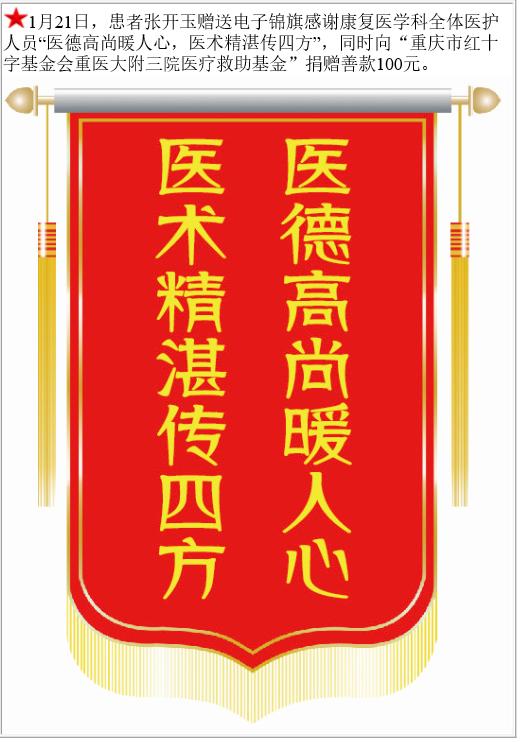 患者张开玉赠送电子锦旗感谢康复医学科全体医护人员,并向医疗救助基金捐赠善款100元。-锦旗-患者心声-患者服务-重庆医科大学附属第三医院【官方网站】