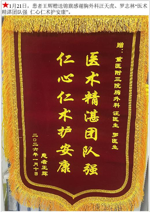 患者王辉赠送锦旗感谢胸外科汪天虎等。-锦旗-患者心声-患者服务-重庆医科大学附属第三医院【官方网站】