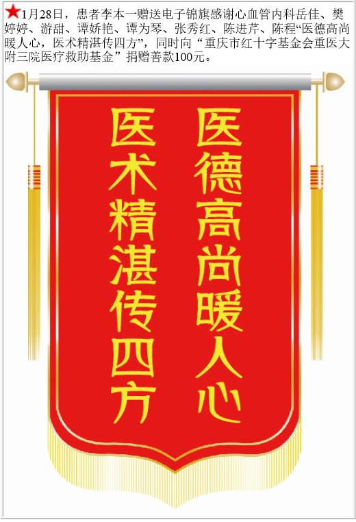 患者李本一赠送电子锦旗感谢心血管内科岳佳等,并向医疗救助基金捐赠善款100元。-锦旗-患者心声-患者服务-重庆医科大学附属第三医院【官方网站】