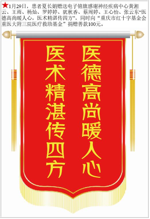 患者夏长娟赠送电子锦旗感谢神经疾病中心黄湘云等,并向医疗救助基金捐赠善款100元。-锦旗-患者心声-患者服务-重庆医科大学附属第三医院【官方网站】
