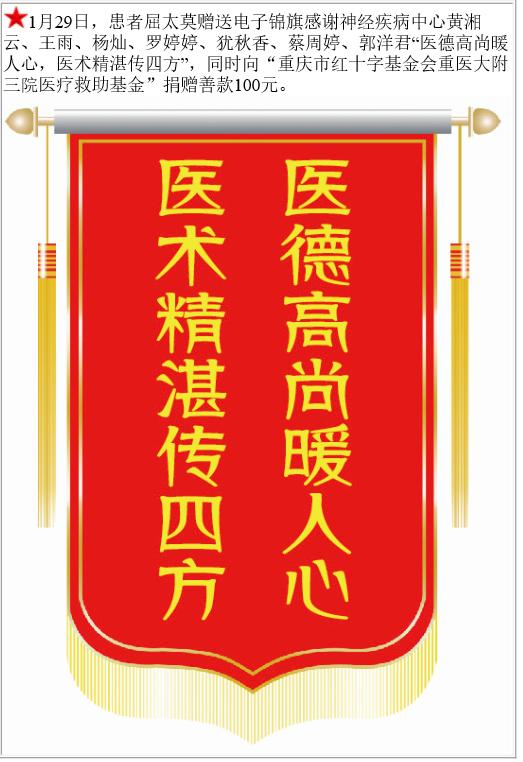 患者屈太莫赠送电子锦旗感谢神经疾病中心黄湘云等,并向医疗救助基金捐赠善款100元。-锦旗-患者心声-患者服务-重庆医科大学附属第三医院【官方网站】