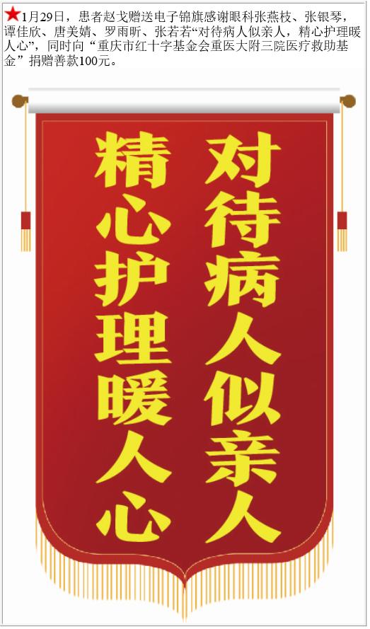 患者赵戈赠送电子锦旗感谢眼科张燕枝等,并向医疗救助基金捐赠善款100元。-锦旗-患者心声-患者服务-重庆医科大学附属第三医院【官方网站】