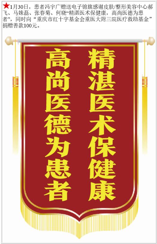 患者冯宇广赠送电子锦旗感谢皮肤/整形美容中心郝飞等,并向医疗救助基金捐赠善款100元。-锦旗-患者心声-患者服务-重庆医科大学附属第三医院【官方网站】