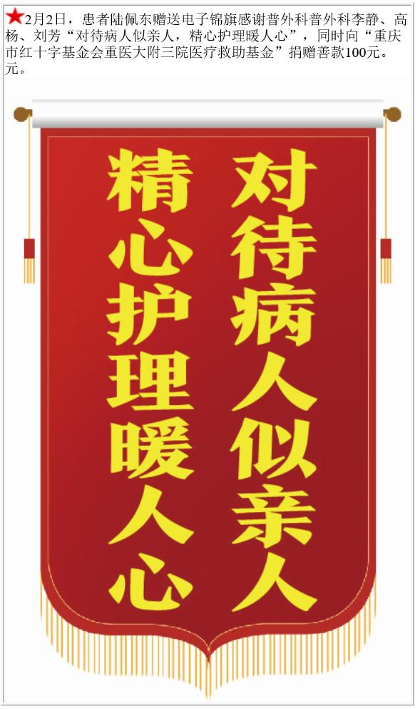 患者陆佩东赠送电子锦旗感谢普外科普外科李静等,并向医疗救助基金捐赠善款100元。-锦旗-患者心声-患者服务-重庆医科大学附属第三医院【官方网站】