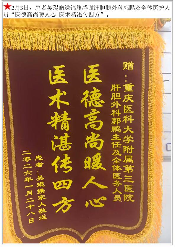 患者吴琨赠送锦旗感谢肝胆胰外科郭鹏及全体医护人员。-锦旗-患者心声-患者服务-重庆医科大学附属第三医院【官方网站】
