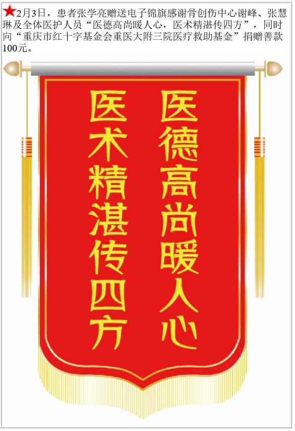 患者张学亮赠送电子锦旗感谢骨创伤中心谢峰等,并向医疗救助基金捐赠善款100元。-锦旗-患者心声-患者服务-重庆医科大学附属第三医院【官方网站】