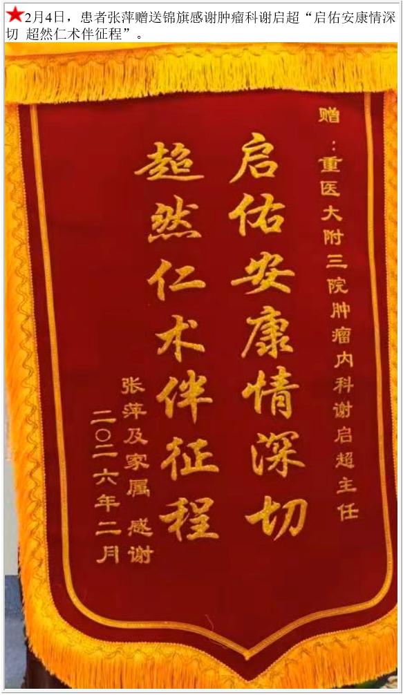 患者张萍赠送锦旗感谢肿瘤科谢启超。-锦旗-患者心声-患者服务-重庆医科大学附属第三医院【官方网站】
