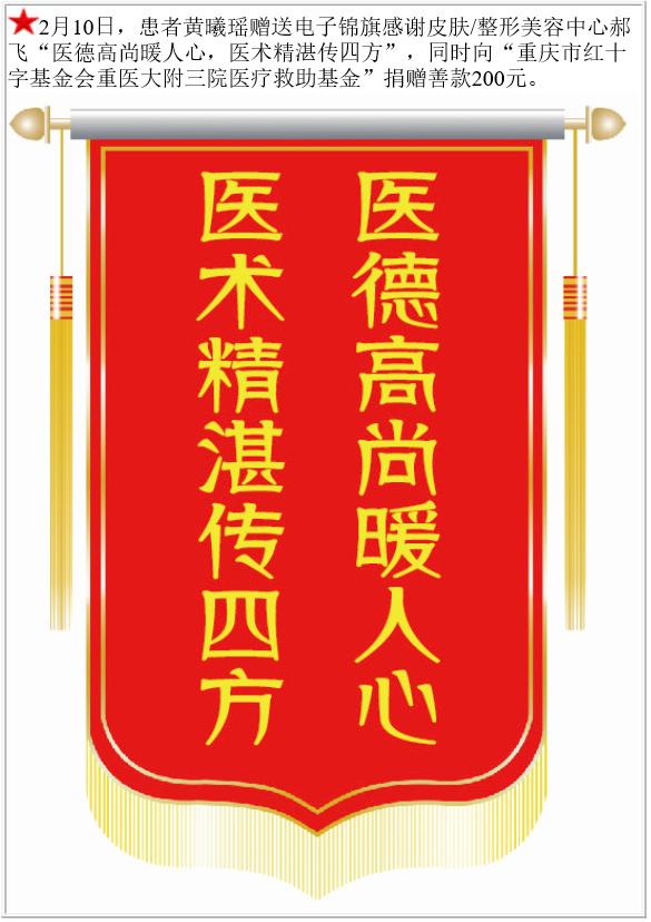 患者黄曦瑶赠送电子锦旗感谢皮肤/整形美容中心郝飞,并向医疗救助基金捐赠善款200元。-锦旗-患者心声-患者服务-重庆医科大学附属第三医院【官方网站】
