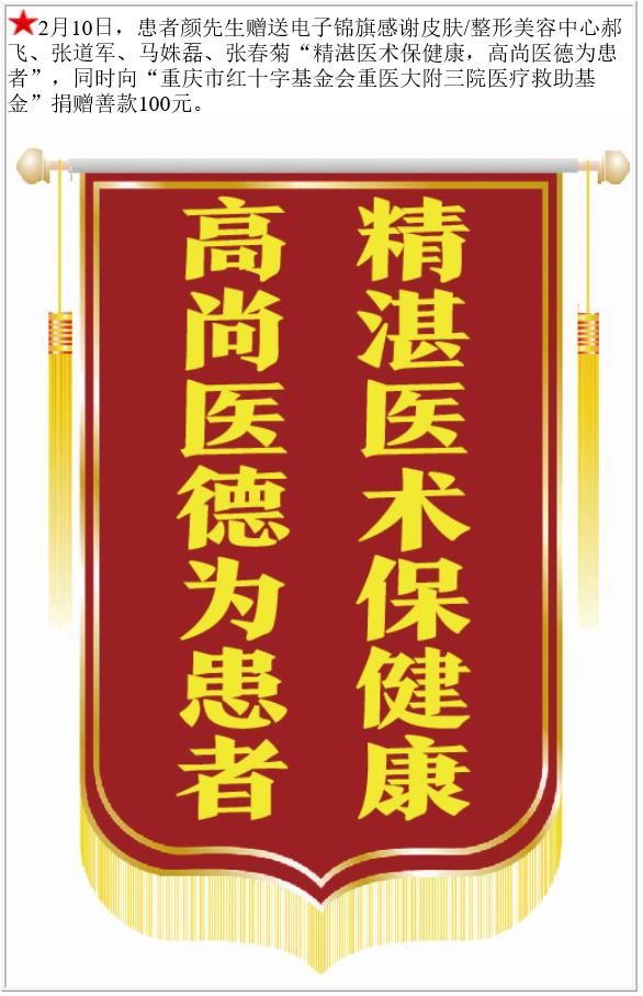 患者颜先生赠送电子锦旗感谢皮肤/整形美容中心郝飞等,并向医疗救助基金捐赠善款100元。-锦旗-患者心声-患者服务-重庆医科大学附属第三医院【官方网站】