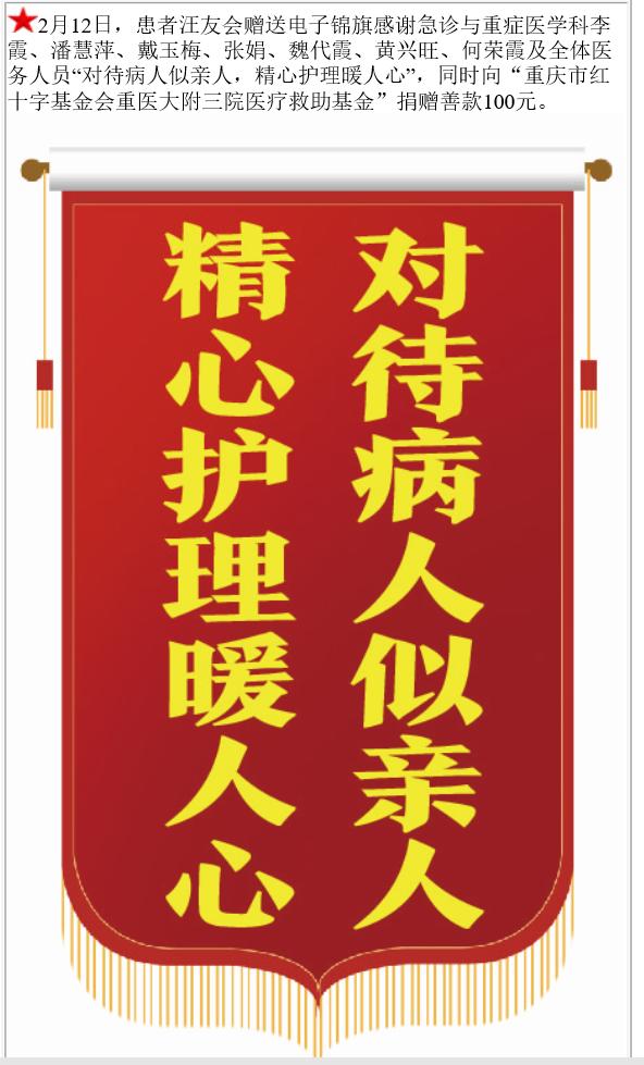 患者汪友会赠送电子锦旗感谢急诊与重症医学科李霞等,并向医疗救助基金捐赠善款100元。-锦旗-患者心声-患者服务-重庆医科大学附属第三医院【官方网站】
