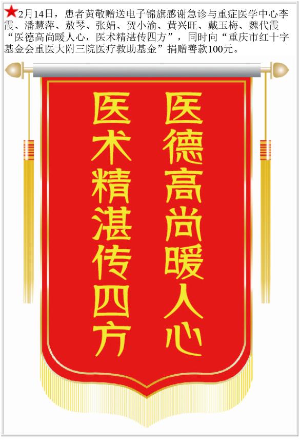 患者黄敬赠送电子锦旗感谢急诊与重症医学中心李霞等,并向医疗救助基金捐赠善款100元。-锦旗-患者心声-患者服务-重庆医科大学附属第三医院【官方网站】
