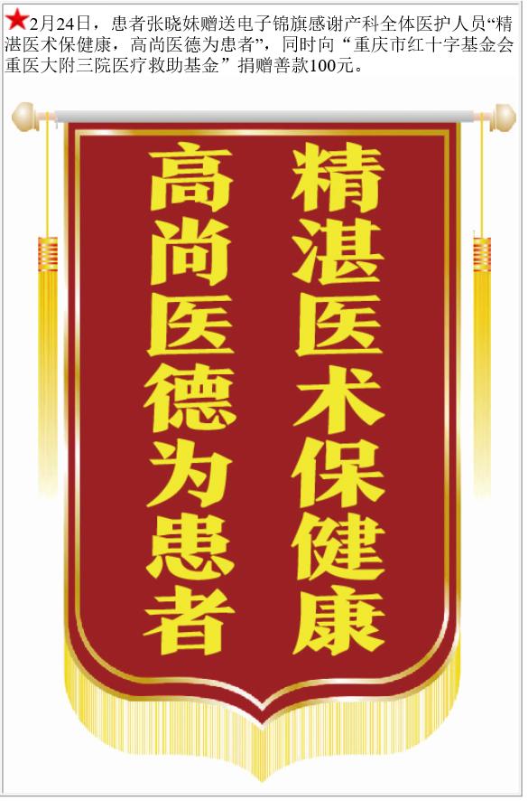 患者张晓妹赠送电子锦旗感谢产科全体医护人员,并向医疗救助基金捐赠善款100元。-锦旗-患者心声-患者服务-重庆医科大学附属第三医院【官方网站】